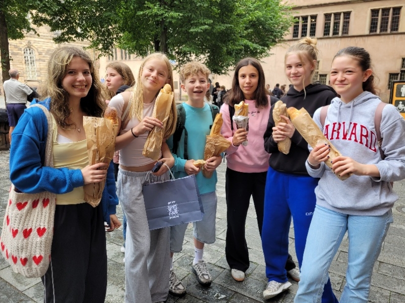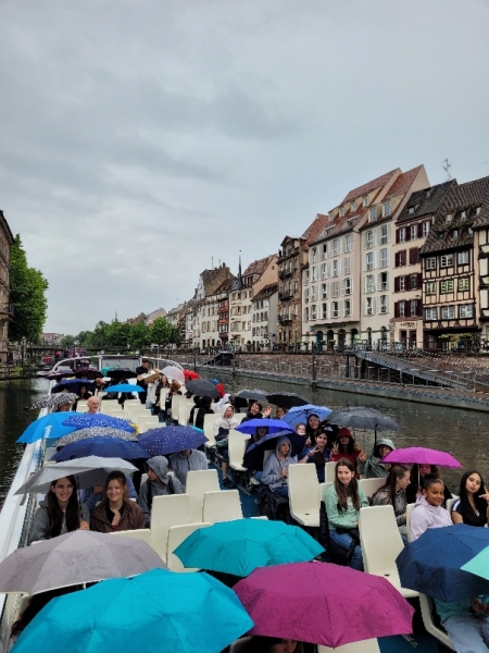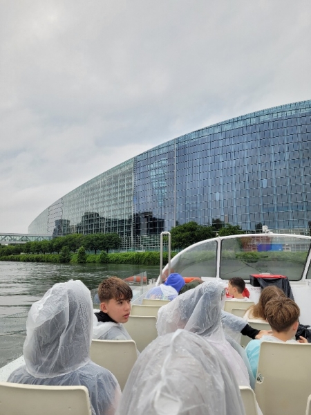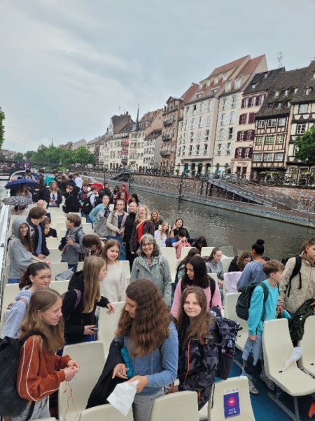 Den heutigen Tag verbrachten die Französischklassen des 8. Jahrgangs gemeinsam im schönen Strasbourg. Leider war es auch regenreich, sodass die Schifffahrt auf der Ill vorbei am Gerberviertel, la petite France bis zum Europaviertel nur mit Regencape im Zipfelmützenlook möglich war. Die anschließende Erkundung von Strasbourgs Straßen und Geschäftswelt fand schon zunehmend trockener statt. Die Zeit verging im Flug...