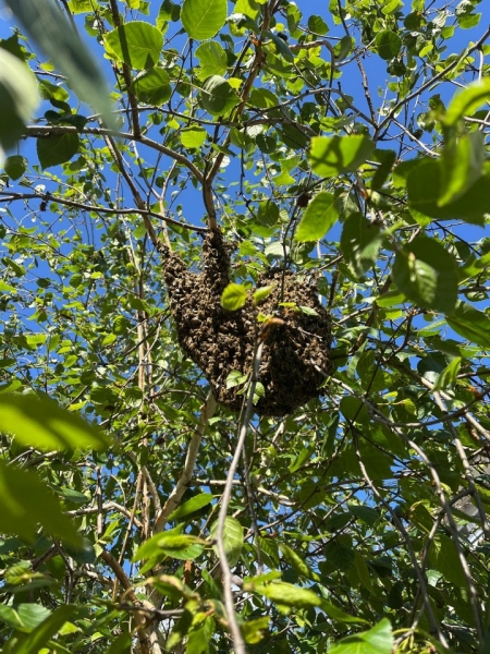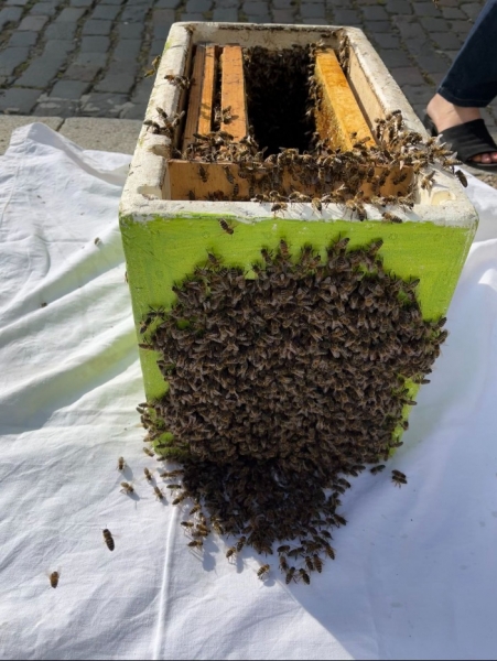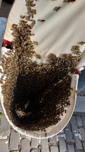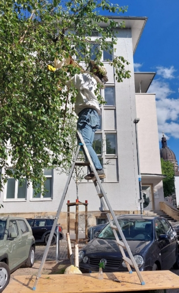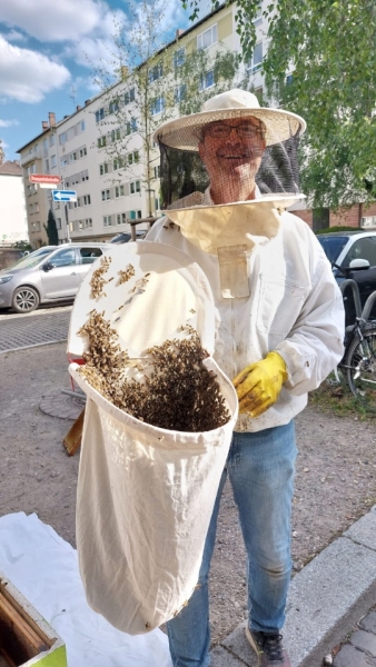 Ein Schwarm unserer FLG-Bienen kam am Freitagnachmittag auf die Idee ein neues Volk gründen zu wollen. Geleitet von diesem Wunsch, schwärmte die Königin mit ihrem Gefolge aus und versuchte sich auf den benachbarten Bäumen der Frauenlobstraße anzusiedeln. Doch zum Glück war unser Kollege und Imker Andreas Rupprecht schnell vor Ort um dem fleißigen Volk ein neues Zuhause bereiten zu können. Jetzt können wir also auf noch mehr leckeren FLG-Honig hoffen…