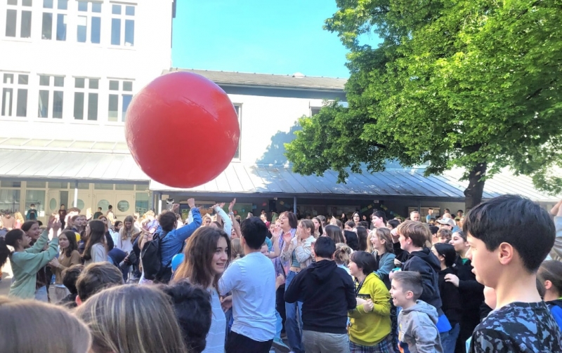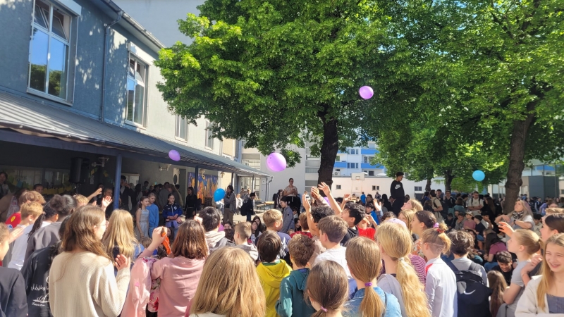 Es folgte eine Challenge, bei dem Teamgeist gefragt war: Zunächst musste die gesamte Schulgemeinschaft gemeinsam möglichst schnell einen der Luftballons berühren - ein Moment, der zeigte, was möglich ist, wenn wirklich alle an einem Strang ziehen. Danach galt es, einen großen Ball so lange wie möglich in der Luft zu halten - durch ständige Zusammenarbeit und gegenseitige Unterstützung.
