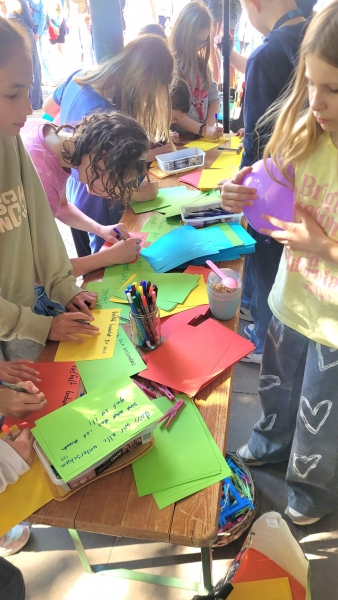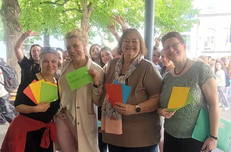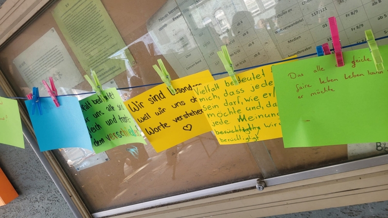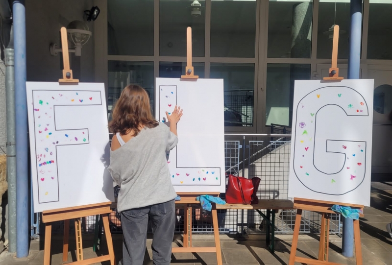 Darüber hinaus gab es mehrere Mitmachaktionen, bei denen die Schülerinnen und Schüler ihre ganz persönliche Perspektive auf Vielfalt einbringen konnten. An einer Station konnten sie eine Botschaft über ihre eigene Definition von Vielfalt oder eine besondere Eigenschaft an sich selbst hinterlassen. Eine weitere Aktion lud dazu ein, den eigenen Fingerabdruck im FLG-Logo zu verewigen - ein sichtbares Zeichen dafür, dass jede und jeder Teil unserer bunten Gemeinschaft ist.