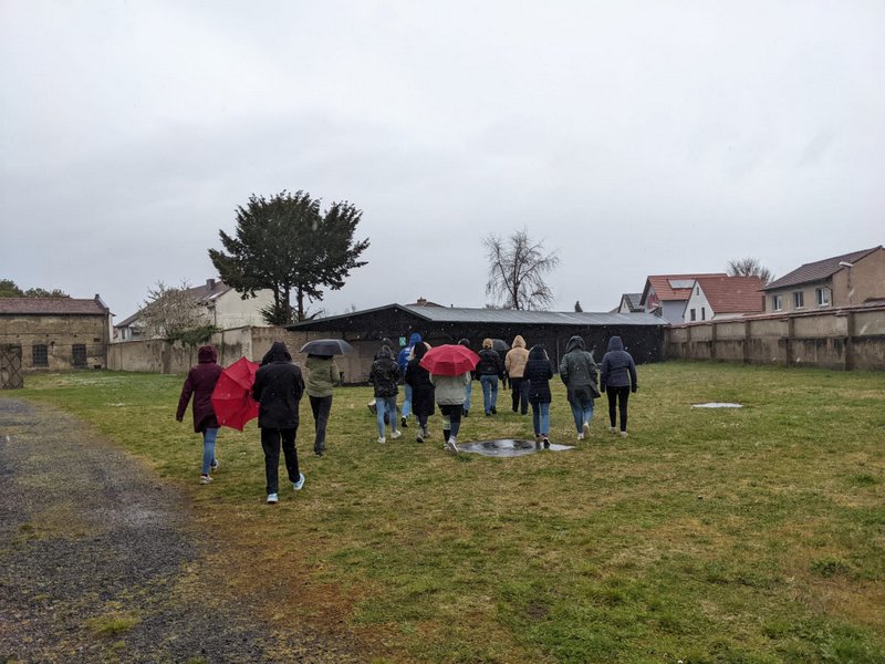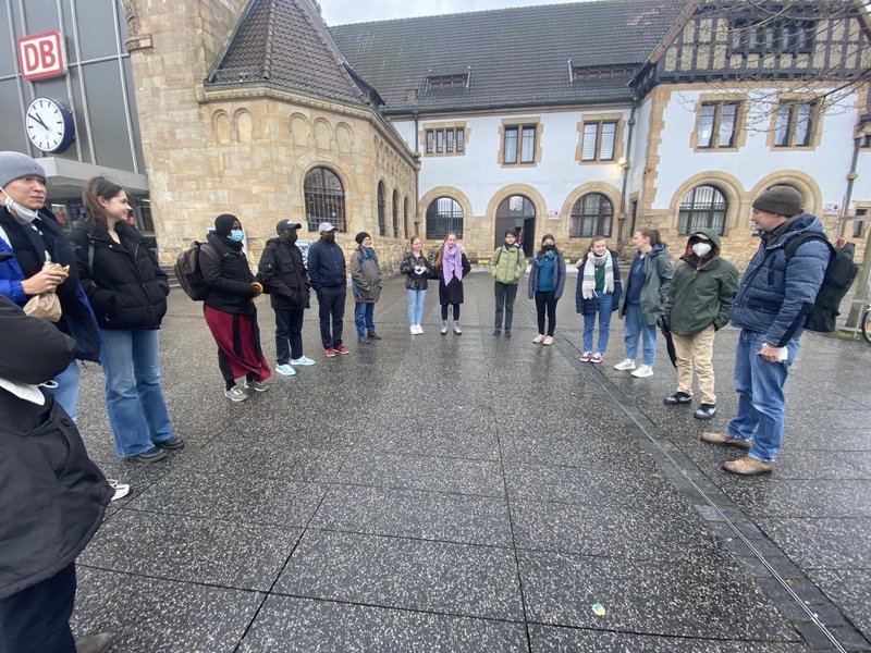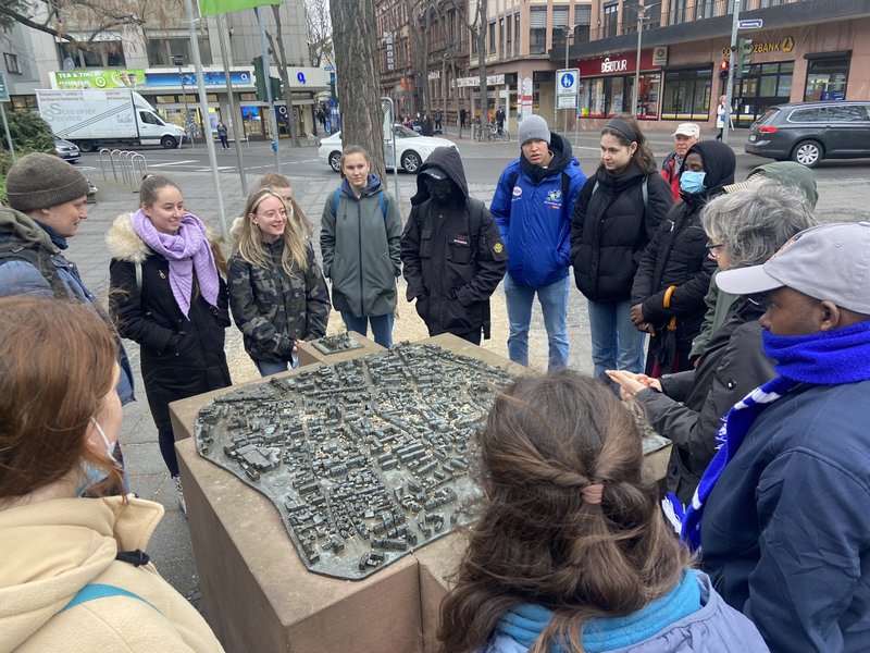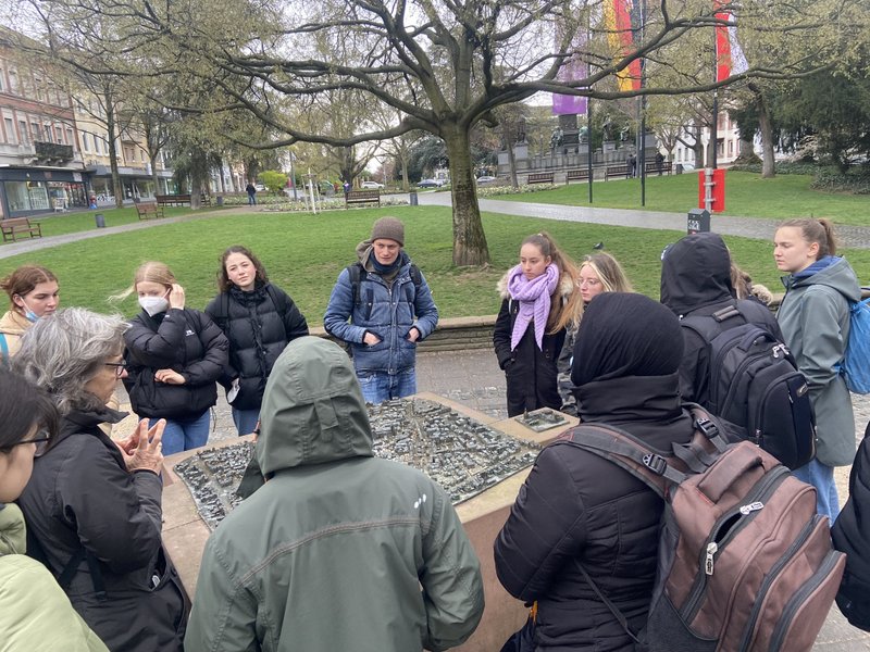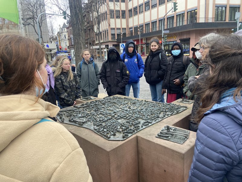 Bei einem Rundgang durch die Mainzer Neu- und Altstadt ging es um die Verankerung von Gedenken und Erinnerung in der Kultur. Der Besuch der Gedenkstätte Osthofen am Donnerstag fiel auf den Tag des Gedenkens an den Genozid in Ruanda vor 28 Jahren und an diesem Tag wie auch bei Gesprächen im Unterricht berichteten die ruandischen Kollegen und Kolleginnen von der Aufarbeitung und dem Umgang mit dieser Vergangenheit in ihrem Land. Am Schulgebäude wehte die ruandische Flagge am 7.April auf Halbmast.