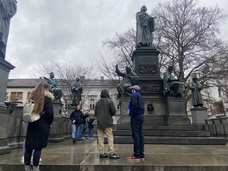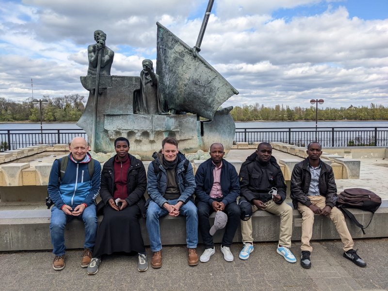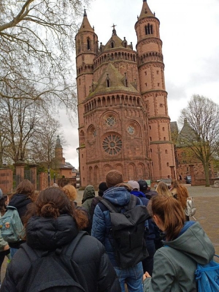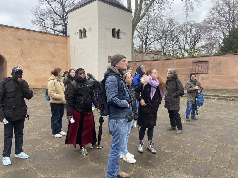 Nachdem Corona in den letzten beiden Jahren dafür gesorgt hat, dass das Austauschprogramm mit unserer Partnerschule in Rusatira im Süden Ruandas nicht wie geplant stattfinden konnte, kamen in der ersten Aprilwoche der Direktor der Schule, Jean Damascene Ndagijimana, zwei Lehrer und eine Lehrerin zu Besuch ans Frauenlob. Zunächst stand der Austausch über Unterricht und die Planung neuer gemeinsamer Projekte im Vordergrund. Unsere Ruanda-Gruppe, die aus Schülerinnen und Schüler der Jahrgänge 10 und 11 besteht, begrüßte unsere Gäste mit Aushängen auf Kinyarwanda und erstellte zusammen mit den ruandischen LehrerInnen Stellwände und Aushänge zur ruandischen Geschichte. Dem rauen Wetter zum Trotz gehörten dann ein Besuch in Frankfurt, in Worms und in der rheinhessischen Weinberglandschaft ebenso zum Programm wie ein Konzert in der Karmeliterkirche.