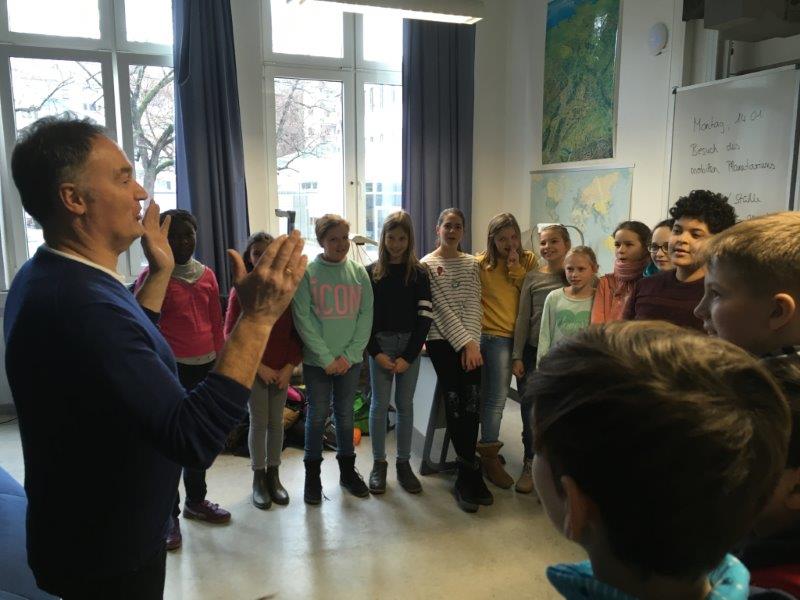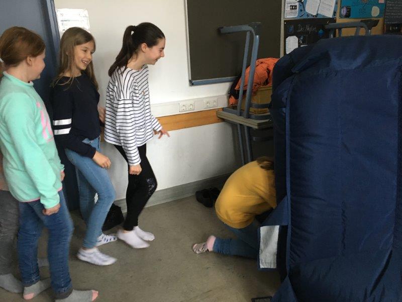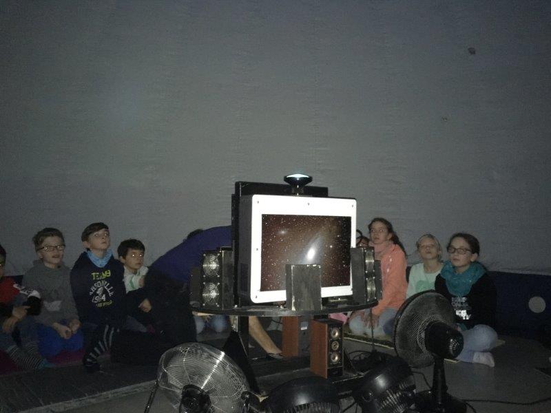 Als wir endlich in den NaWi-Raum kamen, stand dort schon ein riesengroßes Zelt. Nachdem wir hinein gekrabbelt waren, erzählte uns Herr Völkel viele interessante Dinge über Planeten. Aber auch zu bekannten Sternenbilder wie dem großen und dem kleinen Wagen erfuhren wir einiges und Herr Völkel projizierte viele leuchtende, bunte Bilder an die Decke des Zeltes. Das war sehr schön. Die ganze Technik steuerte er mit einer Fernbedienung. Als wir wieder hinaus krabbelten, war die ganze Klasse begeistert. Es war wirklich aufregend. Wir bedanken uns herzlich bei Herrn Völkel!